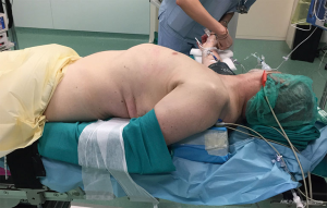 The patient will again lie closer to the left border of the table as most dissection maneuvers will be carried out through the left side. However, in this case the entire chest of the patient will be lifted from the table plane by placing 2 gel rolls or similar aide longitudinally underneath the dorsum, the right arm being simply widely abducted to allow the anesthesiologist to access the venous lines and pressure cuff as needed. Such positioning allows the surgeon to perform the first step of the dissection on the right side without the need for subsequent patient re-positioning and re-draping (Figure 2). The patent’s hips must be secured to allow tilting of the table as necessary.