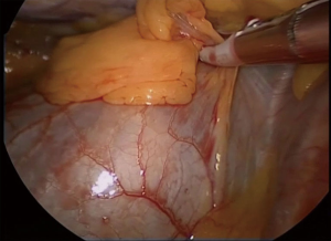 A laparoscopic energy device for tissue handling and sealing is instrumental in all phases of the operation. Our preference goes to radiofrequency devices such as the Maryland laparoscopic grasp, as these cause less smoke in the operative field and are less prone to causing unwanted thermal injury in the proximity of the phrenic nerves.