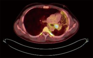 PET CT scan showed the presence of an endobronchial tumour in the left main bronchus (Figure 1). There was some aeration of left lower lobe with a collapse consolidated upper lobe. Endobronchial Biopsy was haemorrhagic. Histopathology suggested the presence of chronic inflammatory cells with no evidence of malignancy. Acid fast bacilli were negative on microscopy and culture. A preliminary diagnosis of endobronchial inflammatory tumour was made and he was scheduled for Robotic resection of Lung.