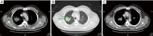 Enhanced chest and abdomen CT scan confirmed a right upper lobar pulmonary mass lesion with small necrotic changes with irregular edges (Figure 2A,B,C). Tru-Cut biopsy confirmed the diagnosis of non-small cell carcinoma, consistent with squamous cell carcinoma, moderately differentiated with prominent necrosis. However, complete staging performed which showed few but less than 1 cm in diameter of mediastinal lymph nodes in the right para-tracheal area, but no distant metastatic lesions found in the abdomen, brain or bones.