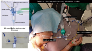 The Arndt blocker is a single unit with 3 working channels which is passed through a single-lumen endotracheal tube. The single lumen tube has three separate channels one each for a wire-guided endobronchial blocker, bronchoscope and ventilation (18). It can be used for patients up to 6 years old below which best to use a Fogarty catheter (Video 5).