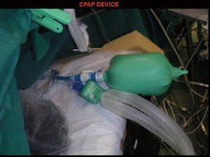 In patients with small peripheral lung nodule and inadequate capacity to support full lung isolation, intermittent ventilation with apnoeic spells can be used to do quick VATS wedge resections. In others insufflating oxygen at 2–4 L/min which is equivalent to 5–20 cm water continuous positive airway pressure (CPAP) or a small amount of CPAP (5 to 10 cm water pressure) applied to the operative side by CPAP device will allow adequate oxygenation and exposure to allow for wedge resections (17) (Figure 6). These measures are usually inadequate for deep seated central lung lesions and clinical conditions requiring prolonged lung collapse.