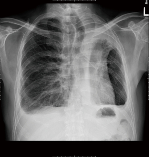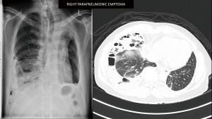 A 45-year-old male diagnosed to have stage 4 non-small cell lung cancer with brain metastases, left pleural effusion and complete obstruction of left main bronchus by tumour invasion. He underwent left main bronchial stenting with metallic stents followed by chemotherapy, immunotherapy and radiotherapy to his brain and left hilum. Six months later he developed chronic pseudomonas stage 3 empyema of the right chest due to chemotherapy induced neutropenia and colonisation of the metallic stent. He was septic and breathless due to his immunocompromised state and impaired lung capacity (Figure 2). As his general condition was poor, decision was made to perform decortication by VATS to decrease the morbidity (9,10). Lung isolation was obtained by selective bronchial blockage of the intermediate bronchus to allow ventilation of the right upper lobe bronchus while surgery was conducted by VATS. The selective lobar isolation was obtained by using Arndt blocker endotracheal tube with the blocker introduced into the intermediate bronchus to isolate the lower and middle lobes to be collapsed whilst the upper lobe continues to be ventilated for adequate oxygenation (Figure 3 & Video 1). This allowed adequate safe oxygenation and exposure for decortication to be performed by VATS (Video 2). The surgical visceral pleural plane in the entrapped lung was better delineated by intermittent inflation of the lung by insufflating oxygen through the blocker channel without deflating the blocker balloon. Post-operative recovery was uneventful and was discharged well with resolution of infection (Figure 4). He was started on immunotherapy with good tumour response. He has remained cancer and infection free 4 years post-surgery.